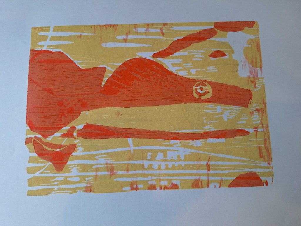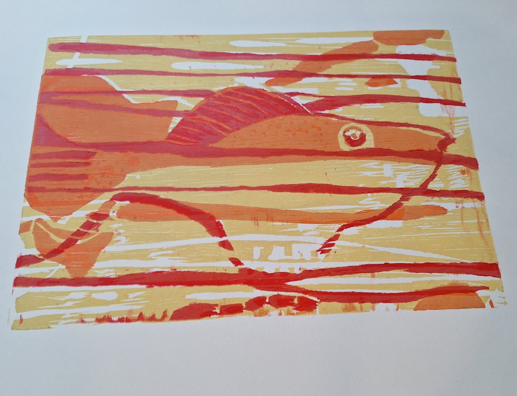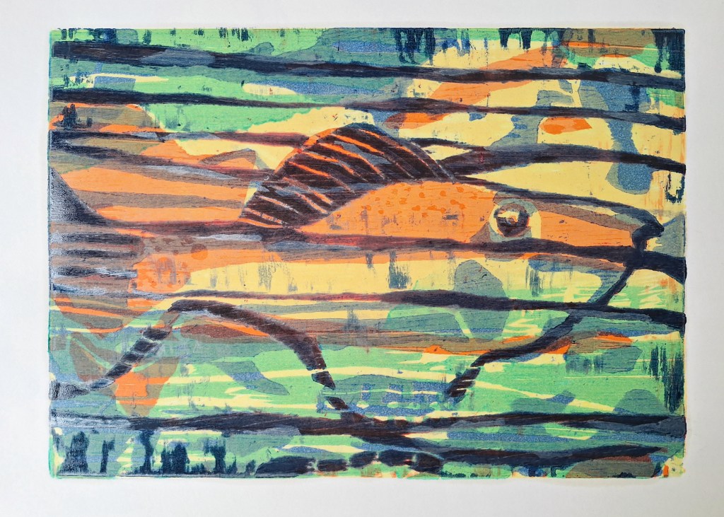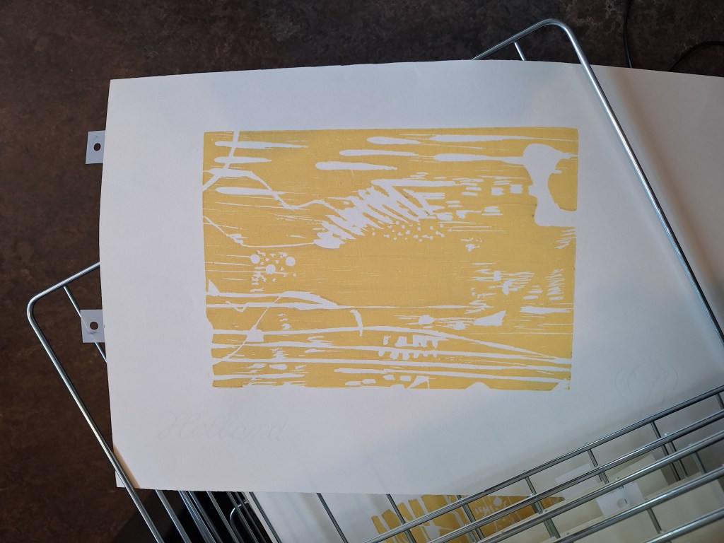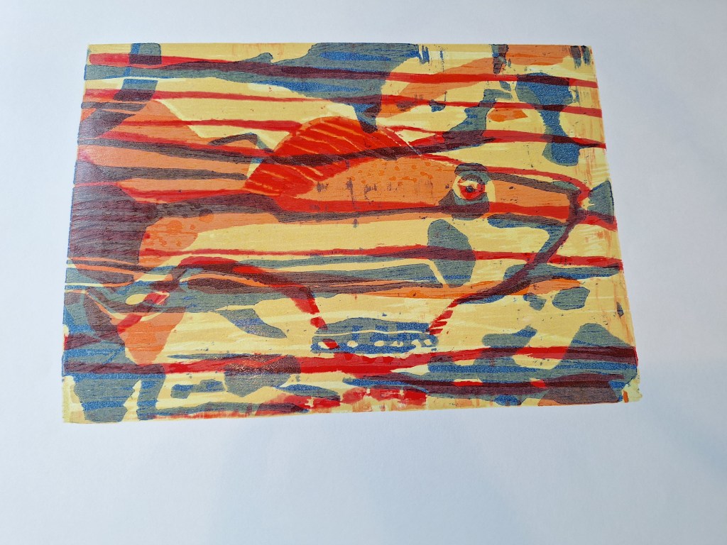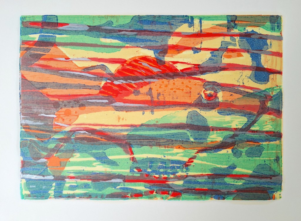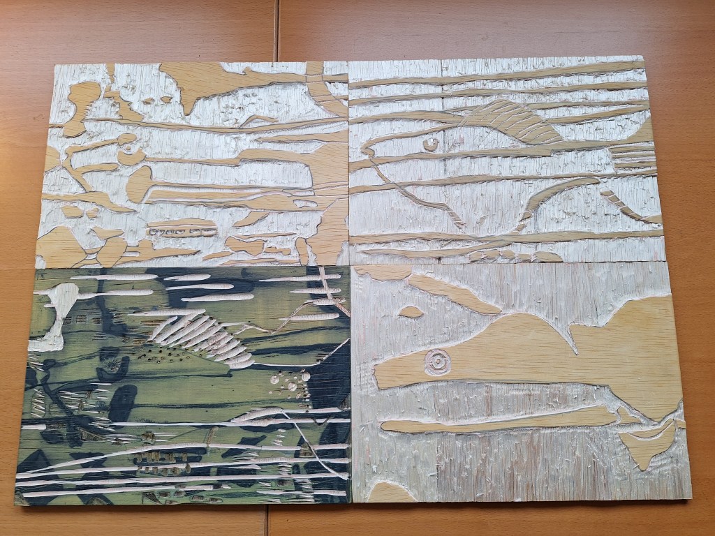 heen. Het hout is met gutsen bewerkt en soms heb ik delen met karton afgedekt tijdens het drukken.