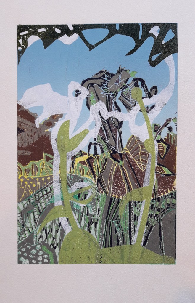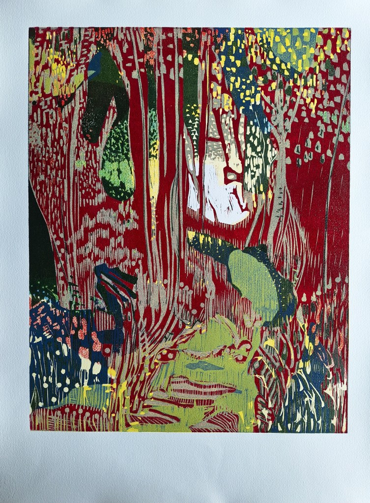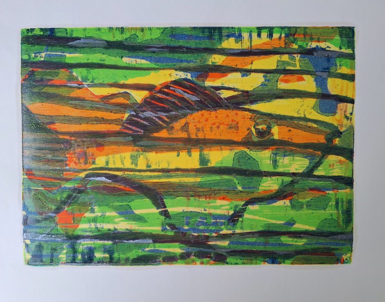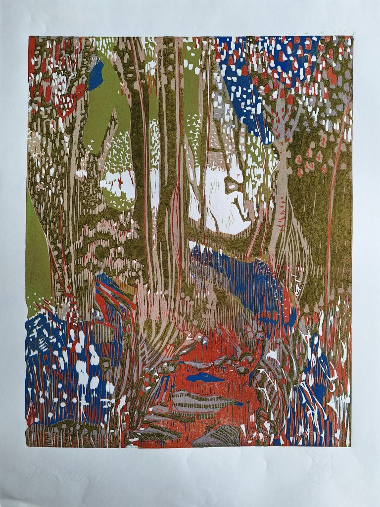 Grafiek 2024 zonder titel 50x25cm houtdruk 2024 zonder titel 50x25cm lino- en houtdruk 2024 Bospad 50x40cm karton- en houtdruk 2024 Vis – Houtdruk op Holland papier. Formaat 19×27 cm. 2024 In het bos. Linodruk